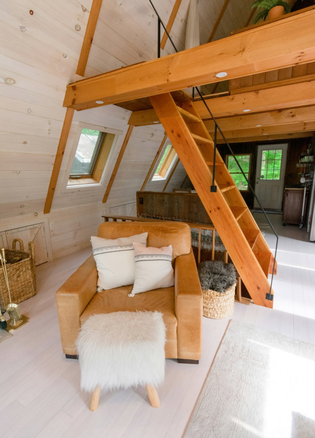 The rug defines the sleeping area and softens the transition between the low bed and the pale floor. Two ottomans in front of the fireplace continue its story in the same style. By using a flat, textural weave instead of a deep pile or pattern, the designer maintained a clean visual plane and a lightweight mood.